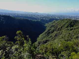 >>> Le fond de la ravine Jean Lauret est toujours dans l'ombre. Au fond, le Bras de la Plaine, puis le Bras de Pontho, Trois Mares .... |