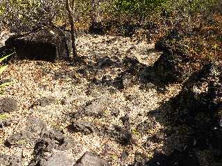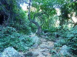 ![]() Le sentier monte de nouveau, sous les arbres, entre les rochers, suivant en hauteur le lit de la Ravine Bassin, mais bientôt un grand tamarin annonce une zone plus dégagée ... | |