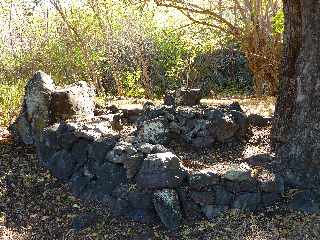 ![]() De grosses pierres ont été disposées en cercle, à gauche du sentier, mais à droite, vers la ravine, la falaise de la rive opposée apparaît ... La montée semble terminée, c'est alors la descente vers le bassin que l'on devine proche ... | |