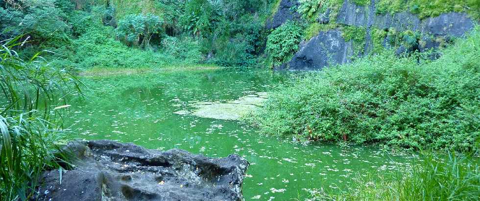 ![]() La pente s'accentue, dans l'ombre, et tout au fond, c'est une eau verte qui semble stagner, parsemée de végétaux flottants ... | |