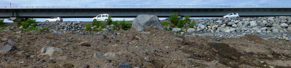 ![]() Entre l'ancien pont amont et le radier, les crues ont décapé la coulée boueuse ...