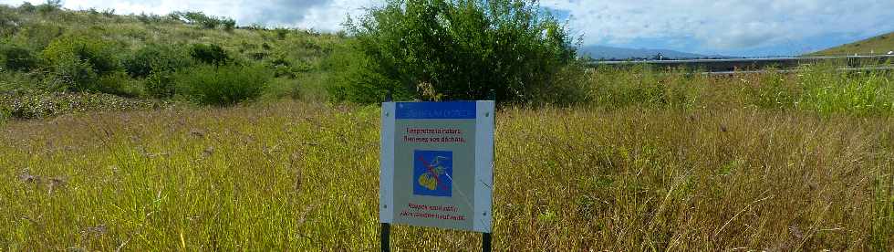 ![]() Un panneau signale Site naturel protégé - Respectez la nature - Ramenez vos déchets - Réspek nout natir - Alon ramène nout salté ...