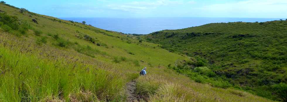 ![]() Les parties ravinées du sentier sont en cours de comblement avec des blocs placés judicieusement. C'est le travail de l'association Les Amis de l'Océan indien, dont les membres effectuent des travaux de rénovation et d'entretien des sentiers de la savane, en sensibilisant le public à la lutte contre les dépôts sauvages ... |
