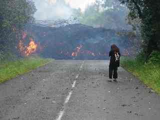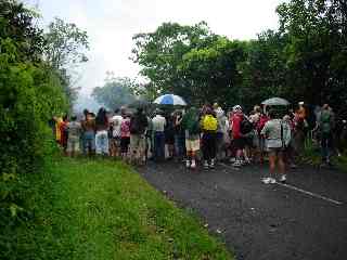 <<< La pluie se met à tomber. L'heure H approche, chacun se tient prêt à immortaliser l'événement. Aujourd'hui, pas de premier plan possible avec un panneau stop ! Au centre de la photo, une giclée de gaz sort d'un ancien tunnel de lave proche de la chaussée .... |