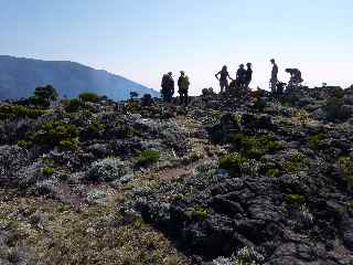 ![]() Le Piton Rouge annonce l'arrivée au bord de l'Enclos, mais encore pas de trace d'éruption en vue ! Quelques randonneurs croisés en route, après la nuit sur place, confirment qu'il faut aller plus loin ... Ce n'est qu'après avoir dépassé la bifurcation avec le GR R2 qui plonge vers Basse-Vallée que les premières fumerolles apparaissent. |