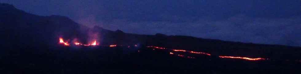 ![]() A près de trois kilomètres à vol d'oiseau, vers 2 000 m d'altitude, une fissure longue de 250 mètres s'est ouverte, ornée de quatre petits cônes. Malheureusement, un fort vent rabat les fumerolles en direction des spectateurs, masquant partiellement la faille et les fontaines de lave ... Les différents bras se rejoignent rapidement en une coulée d'environ 1,6 kilomètre, allant s'étaler pour le moment autour du Gros Bénard (1972) |