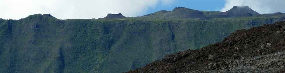 ![]() Vers l'aval - Au fond, le rempart nord de l'Enclos Fouqué, le Piton de Partage, et à droite, le Nez Coupé de Sainte-Rose ... |