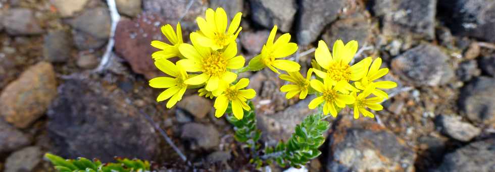 ![]() Le sentier longe le rempart de la rivière de l'Est, parfois bordé de dalles érodées ou de lapilli orangés ...