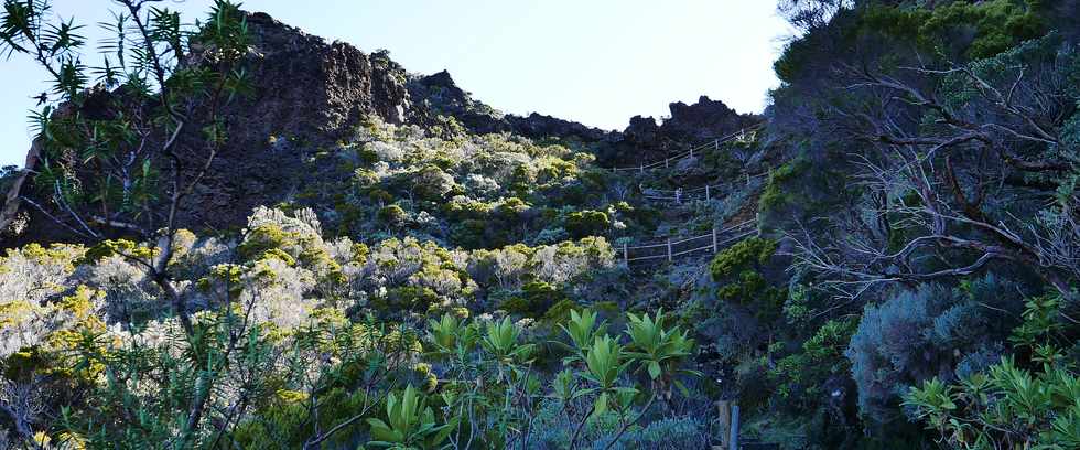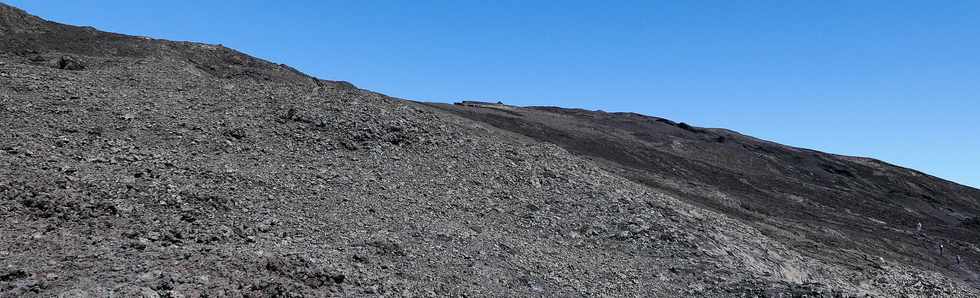 15 août 2018 - Piton de la Fournaise - Enclos Fouqué - Le retour vers le Pas de Bellecombe s'effectue sous un soleil de plomb, et avec la disparition de la Chapelle de Rosemont et les 1 200 mètres de balisage modifié, la distance parcourue augmentée de 300 mètres nécessitera une mise à jour des temps de parcours affichés sur les panneaux ...