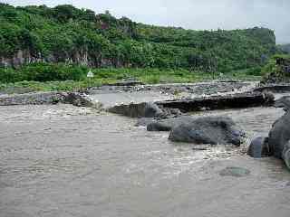 <<< Retour vers la rivière d'Abord, en amont, sur les radiers du chemin de Bassin Plat. Ici aussi, on ne passe plus ! Il faut descendre jusqu'au pont du port de St-Pierre. La police municipale veille, il ne s'agit pas de traverser. La force du courant est impressionnante et chaque année, quelques uns l'apprennent à leur dépends ... |