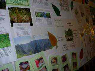 <<< Parmi les travaux de nombreuses classes, allant de la réalisation de sculptures (Ilet Furcy) à celles de marionnettes, de figurines en terre, de panneaux en végétaux ou de maquettes de volcans, les élèves des trois CM2 de l'école Jean-Jaurès et leurs enseignants ont réalisé un herbier virtuel (dommage que les ordinateurs ne soient pas allumés !) ainsi que plusieurs panneaux relatant leurs visites de différents sites forestiers de l'île. |