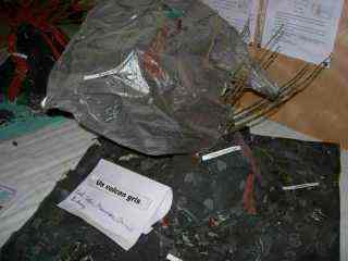 <<< A côté, le volcan "gris", émettant des cendres, représentées par un sachet de plastique noirci ... |