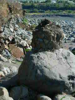 >>> Là, l'eau a décapé les alluvions autour de ce bloc, en laissant un chapeau de petits galets soudés dans une masse terreuse ... |