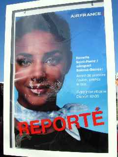 >>> Rue Luc-Lorion, devant l'agence, la publicité pour la mise en place de la navette Air France présente un bandeau rouge "reporté" - Saint-Pierre/Aéroport Roland-Garros : avant de prendre l'avion, prenez le bus. Gare interurbaine - Départ 18 heures .... 1er juillet 2011 - Rue Luc Lorion - Rappel - Vous ne verrez pas encore la navette Air France partir directement pour Gillot, les 28 chauffeurs de taxis de l'aéroport ayant réussi à convaincre le Conseil général et la Chambre de commerce d'annuler leur autorisation, après manifestation et opération escargot pour garder leur monopole ... |
