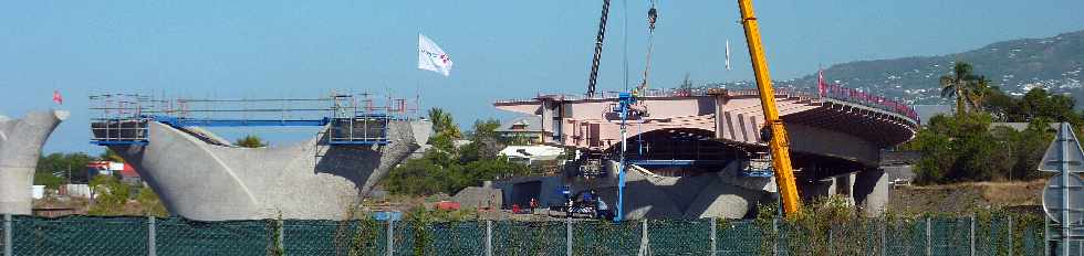 ![]() Rive droite - La pose des pré-dalles (coffrage perdu) sur la partie courbe du tablier est déjà bien avancée.