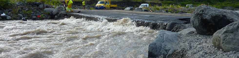 terrains en amont, liés par exemple à l'éboulement d'octobre 2006 dans le Bras des Roches Noires (pour le Bras de la Plaine). Des pans entiers de berges peuvent également brusquement basculer dans le courant. De même, des points hauts peuvent rapidement se retrouver entourés par l'eau ou sapés par des eaux souterraines ... | |