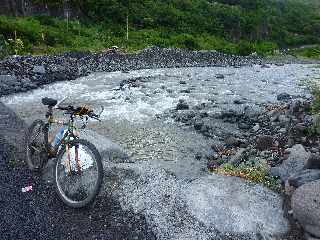 ![]() Bras de Cilaos - Radier du Ouaki - Les engins sont partis. Au radier sud (vers Saint-Pierre) l'eau continue de s'écouler par les buses dans le chenal creusé en aval.