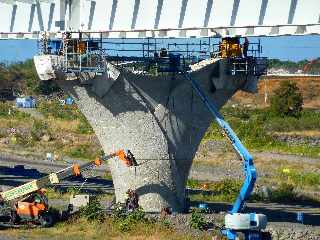 ![]() Un vide, entre les piles P2 et P3, qui sera comblé par la pose à la grue des derniers éléments de charpente ... | |