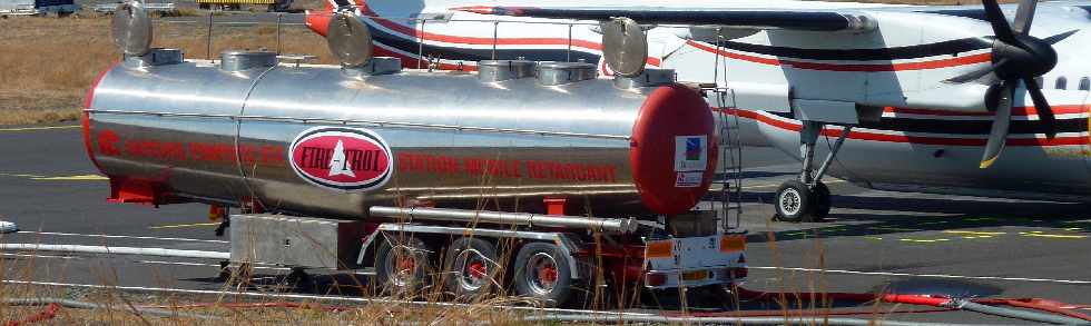![]() Au bout de l'aire de parking habituellement réservée aux moyens porteurs est installé le pélicandrome, citerne de 28 000 litres, permettant le ravitaillement autonome du Dash, avec éventuellement l'adjonction d'un volume de 20% de produits retardants, de couleur rouge, stockés dans les bacs à proximité ... A chaque extrémité du pélicandrome, une citerne de 5 000 litres d'eau, au centre une citerne pouvant contenir le mélange eau-produit retardant. A noter que le produit retardant ne peut pas être utilisé au-dessus des champs de cannes, celles-ci devenant exclues du circuit de transformation en cas de contact avec le produit ... |