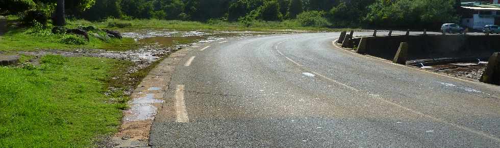 ![]() De l'eau boueuse stagne encore en amont du radier, et les drains placés au-dessous de la chaussée font leur effet ... |