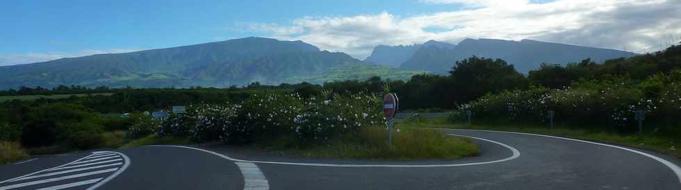 ![]() ... et vers Saint-Louis, par le cirque des Makes et la vallée du Bras Patates. Le cirque de Salazie s'est aussi retrouvé en partie comblé lors de cette phase explosive, et au niveau des falaises de l'Entre-Deux, la couche fait quarante mètres ...