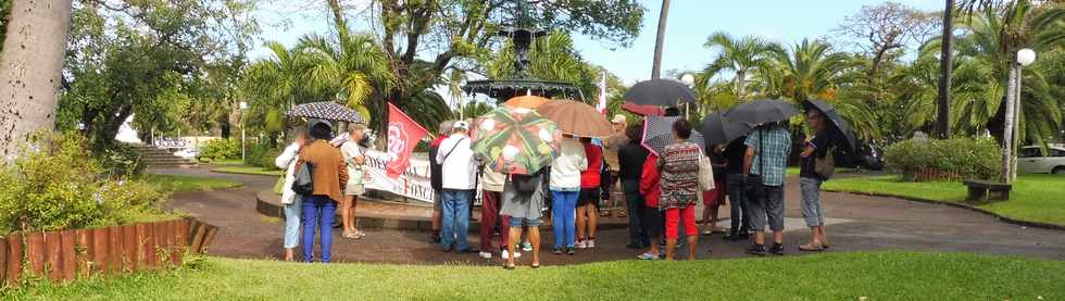 14 juin 2018 - Saint-Pierre - Jardins de l'hôtel de ville - Malgré les nombreux passages d'averses, près d'une quarantaine de retraités se sont rassemblés ce matin pour écouter Max Banon, de la CGTR et une représentante d'ATTAC, dénonçant les attaques du gouvernement contre les retraites ...